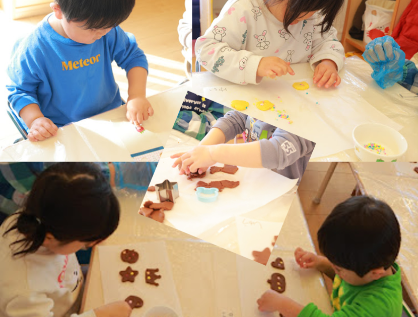 クッキーを入れる袋にシールを貼ってかわいくしたり、ココアの生地をクッキーの型でぬいてお星さまの砂糖をぎゅっぎゅっとしたり、かぼちゃのクッキーをコロコロしてつぶしたりしました。