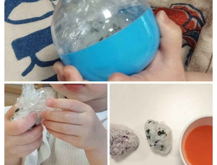 ラップに軽く包んだ2種類のご飯を0歳児さんはカプセルの中に入れてふりふり。1.2歳児さんはラップの上からにぎにぎしておにぎりを作りました!