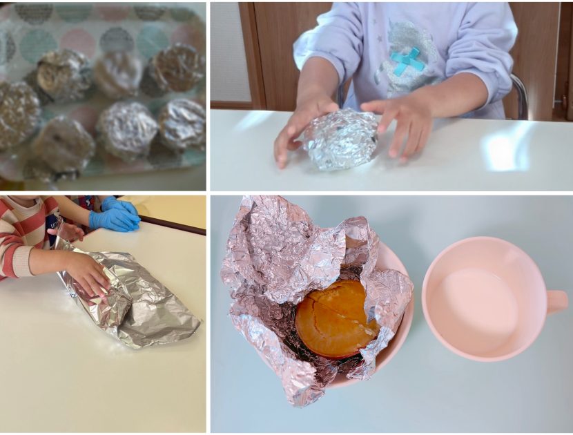 収穫してもらったさつまいもを使って、さつまいもをアルミホイルで包んでもらいました☺️